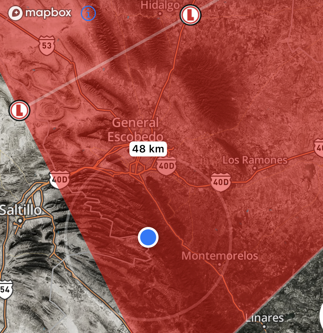 En esta imagen se muestra con el globo magenta con estrella blanca la localización de la zona serrana de Santiago, N.L.